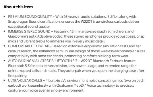 (Excellent) Edifier W220T True Wireless Earbuds Bluetooth V5.3 Semi-in-Ear Earphones with Mic
