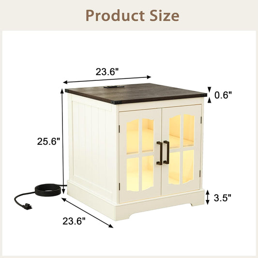 (New Open Box) ChooChoo Farmhouse End Table, 24" Large Sofa Side Table with Charging Station & LED Light, Nightstand with Adjustable Storage Shelf, Square Bedside Table for Living Room Beige (Cream Mix with White)