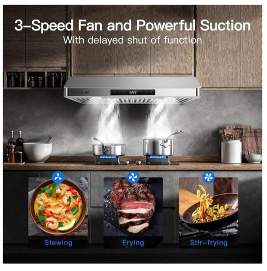 (New Open Box) AMZCHEF 30" Under Cabinet 430 Steel 700CFM Hood with Smart Touch/Remote, 3-Speed, Timer, LED Lighting & Dishwasher Filters