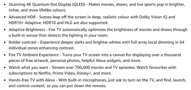*Stunning 4K Quantum Dot Display (QLED) - Makes movies, shows, and live sports pop in brighter, richer, and more lifelike colours.