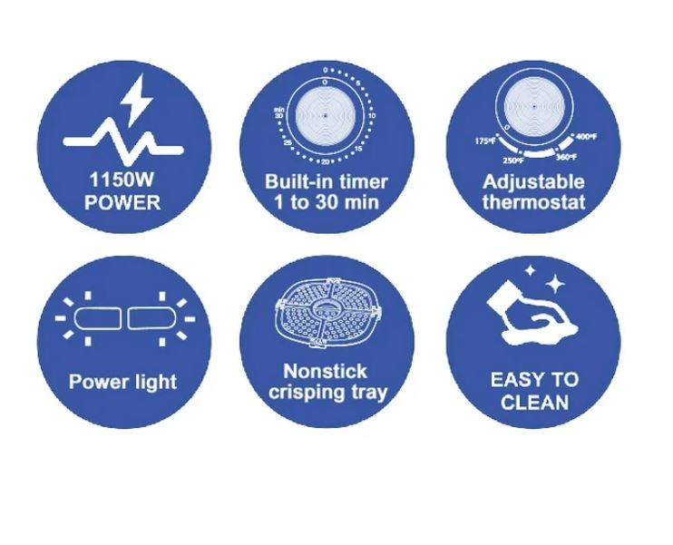 120V-60Hz,1150W.This product is new condition for Healthy Cooking with nonstick coated pan& tray. It is User Friendly and Adjustable Temperature Control with Timer & Auto Shutoff. Fast & Easy comfort food, Dishwasher Safe Basket. You can make a variety of food; The basket and tray are removable and top rack dishwasher safe. Perfect for any small kitchen, dorm room, and more! Reheat your leftover fried foods to become exactly as they were when first fried. Achieve perfect fried results with little or even at least 98% oil less! Temperature range from 175°F to 400°F allows cooking at your desired temperature, achieving a healthy, crispy.