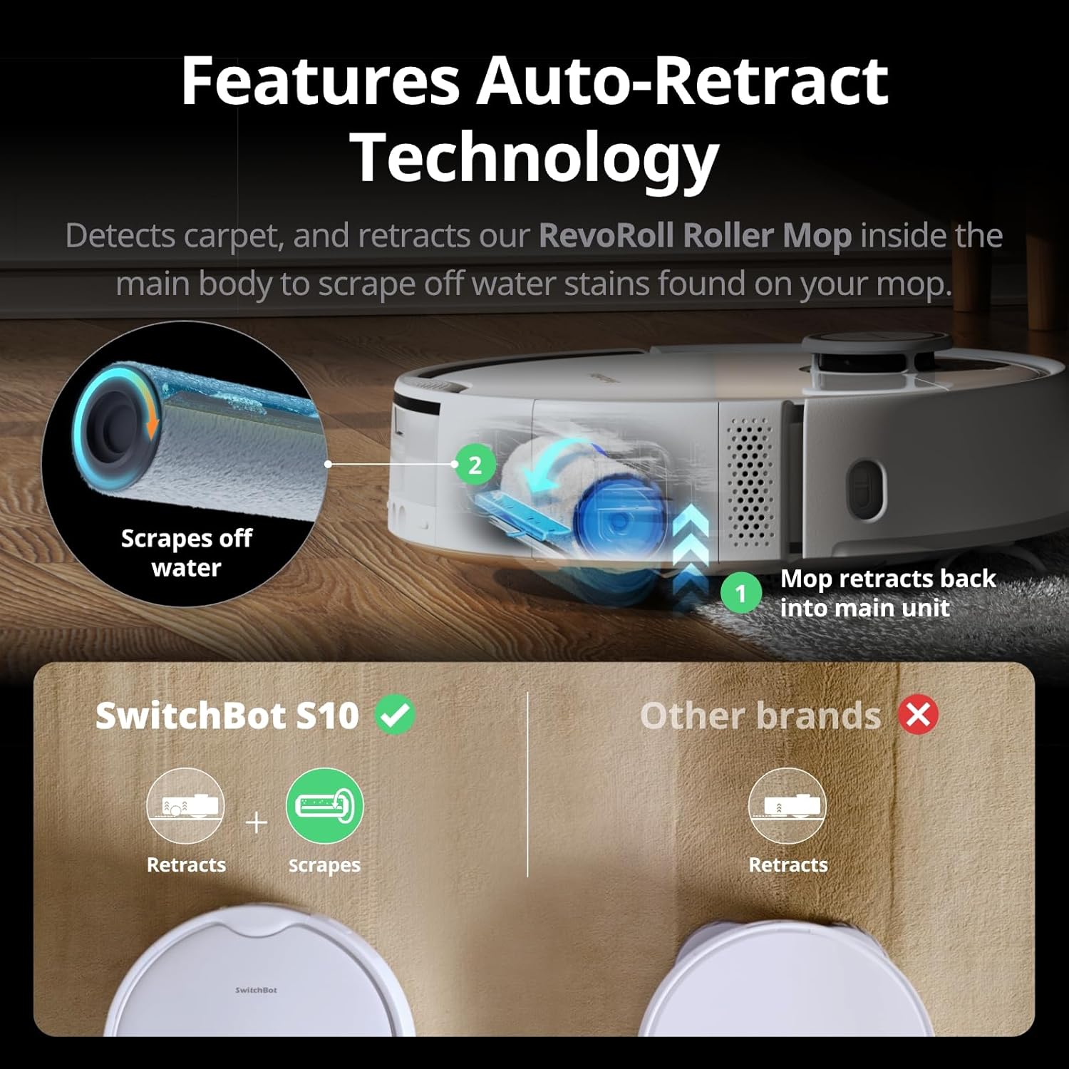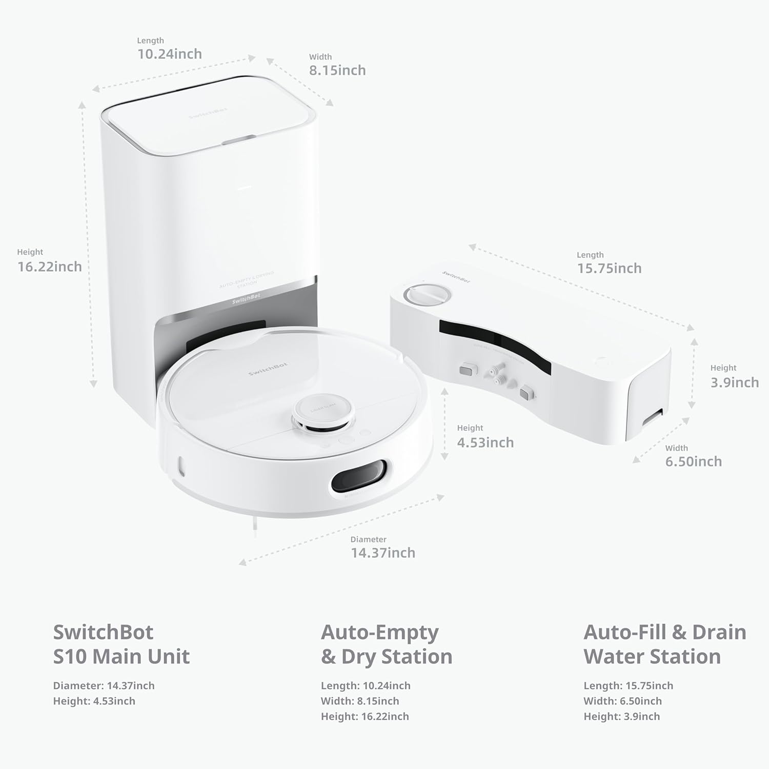 - 100% Fully Automated Cleaning: SwitchBot S10 uses a Dual Station Design to make cleaning hands-free. It also includes a large 4L capacity dust collection bad for up to 10 weeks of waste storage. It also features a never before seen Water Station that directly connects to household plumbing systems, eliminating the need for manual water refilling or draining. It can also Self-dry its own Roller Mop using hot air at 50 ℃, and drain waste water when collected to keep bad smells at bay.