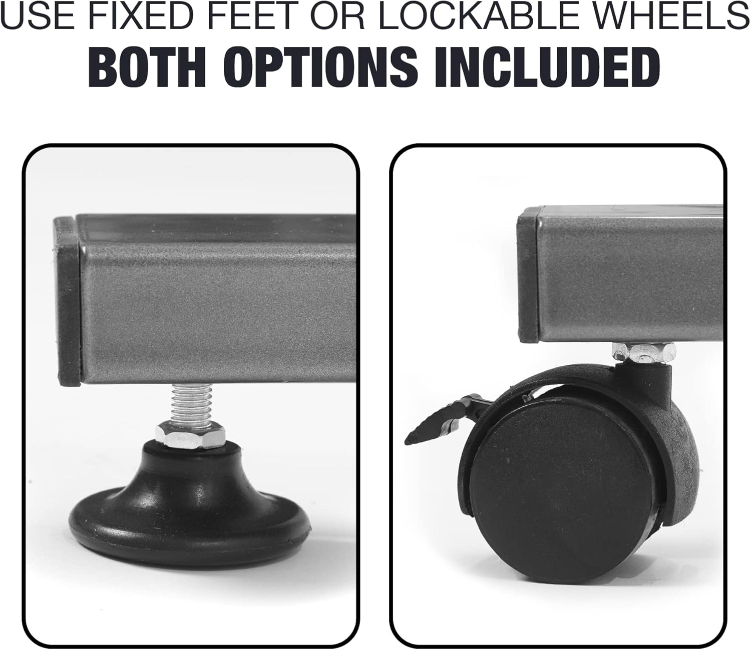 Includes standard desk-feet , easily replaceable with lockable casters