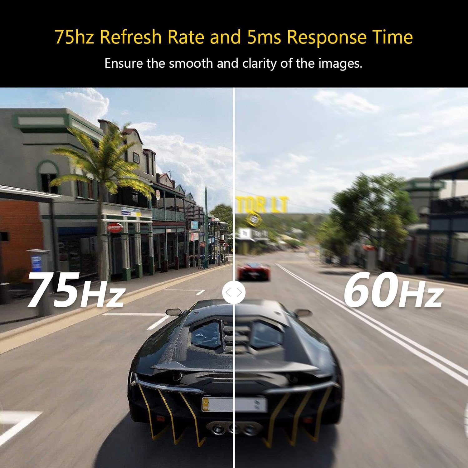 [Rapid 75Hz Refresh Rate and 5ms Response Time]With the lightning 75Hz refresh rate and 5ms response time, the display dramatically reduces the motion blur, picture stuttering and ghosting. The fast response time brings a steady visual, giving the users the exceptional gaming experience. Flicker-free and low blue light technology minimizes blue light to protect your eyes from strained after the prolonged use of the monitor.