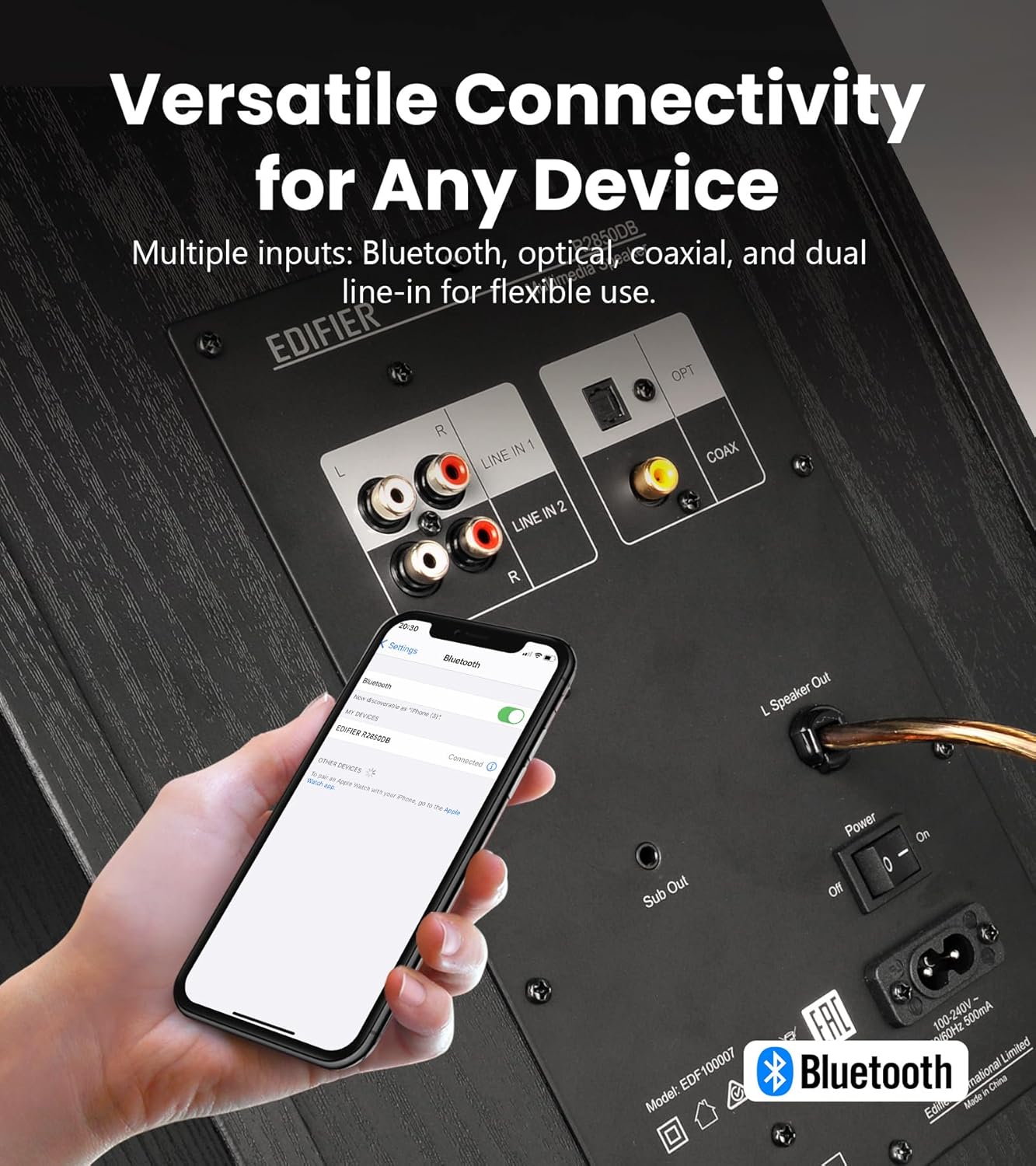 VERSATILE CONNECTIVITY - Line in 1, line in 2, optical, coaxial, Bluetooth V5.1 input enable connection to the computer, turntable, TV, set-top box, DVD, and other sound source devices of your choice.