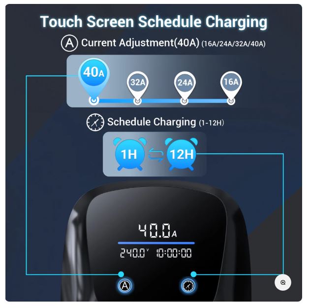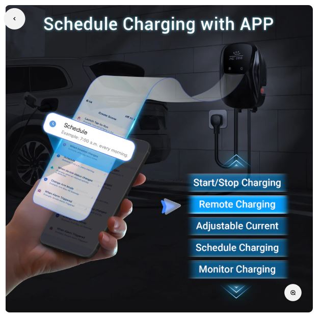 【Three Reservation Approaches】: W02 offers a touchscreen, smart App, and vehicle's onboard system (default plug-and-play) reservation. Schedule off-peak charging to cut costs, with App features for expense tracking, etc.