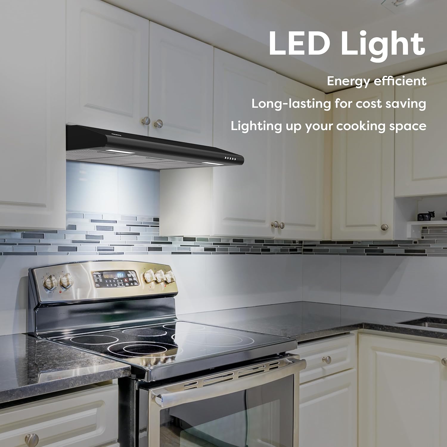 * USER-FRIENDLY DESIGN: Range hood 30 inch under cabinet with mechanical push button for convenient control. Quiet operation, 6.5 Sones max at the highest speed.
