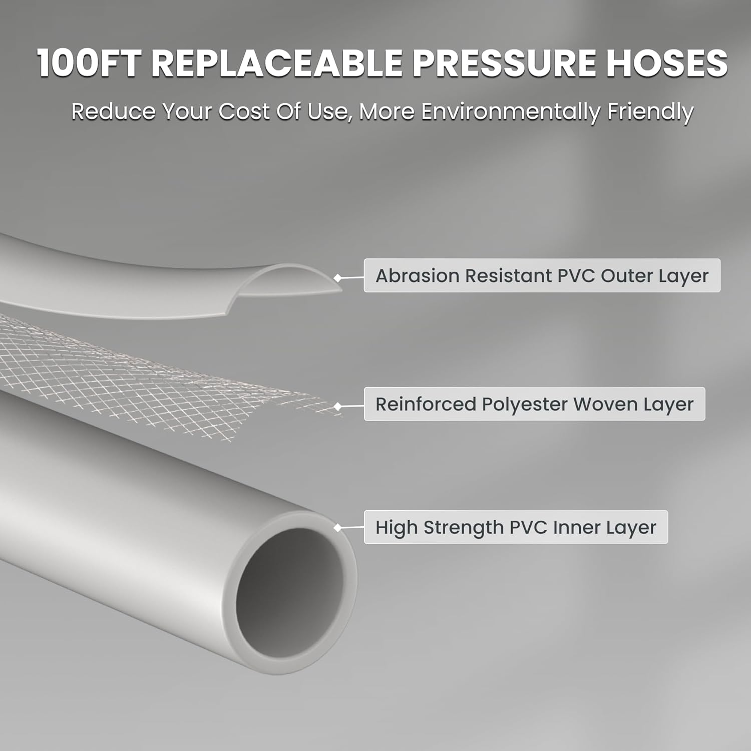 * 100ft Replaceable Pressure Hose: Giraffe Tools Power Washer featuring a 100ft replaceable hose(32°F-104°F). Constructed with three-layer composite anti-explosion material, it's designed to tackle even the toughest cleaning jobs. The detachable hose is for easy recycling and reuse, reducing the amount of product waste