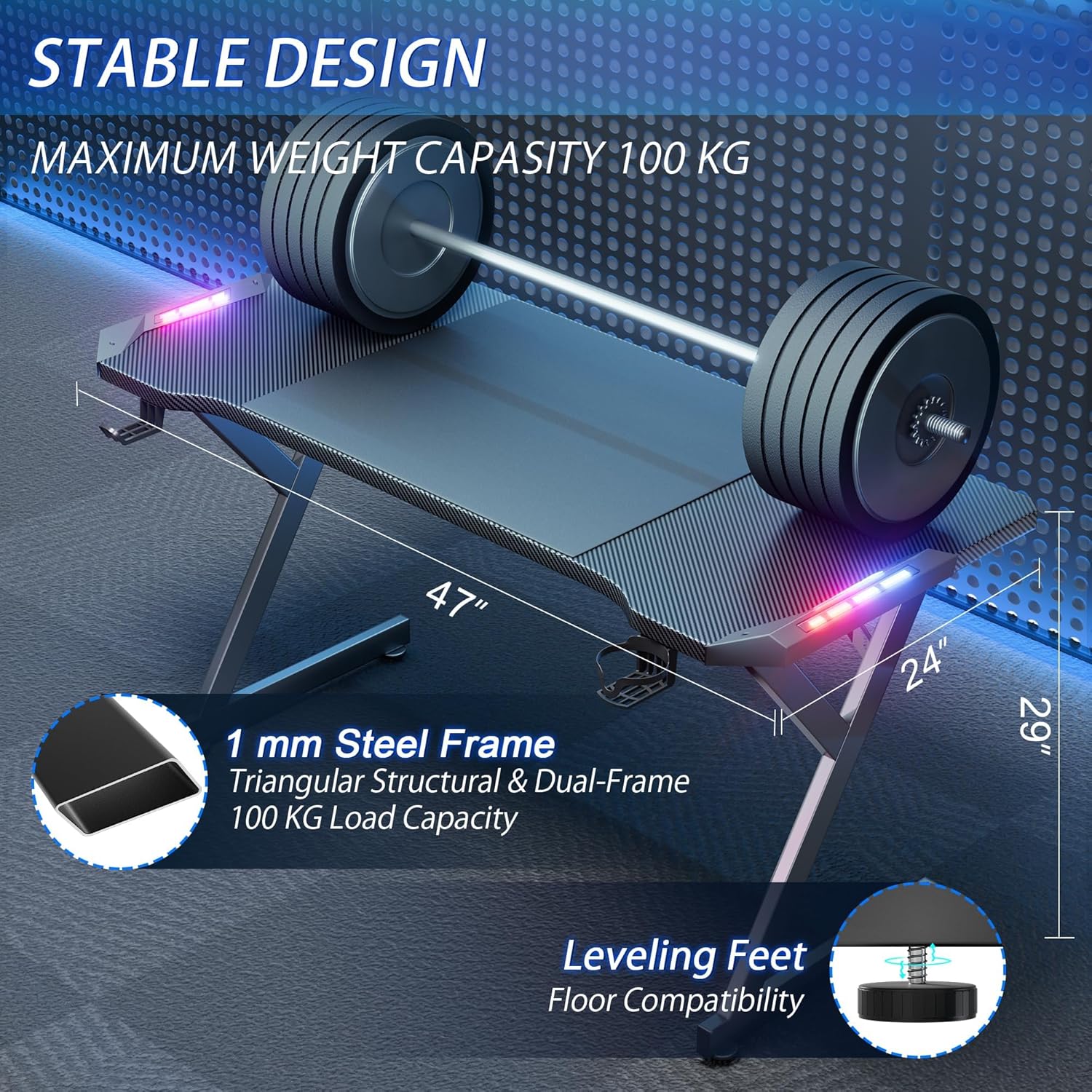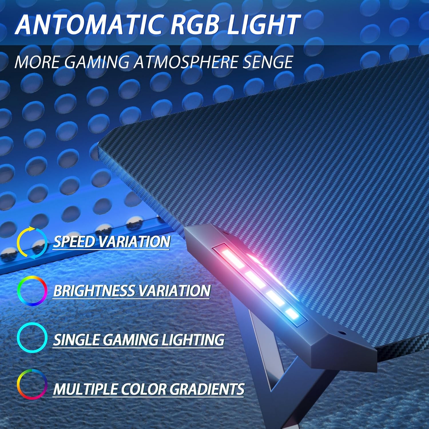 (New Open Box) HLDIRECT 47 Inch Gaming Desk with LED Lights, Home Office Gamer Desk, Ergonomic Computer Desk with Large Carbon Fiber Desktop, Computer Table with Cup Holder & Headphone Hook for Home Office