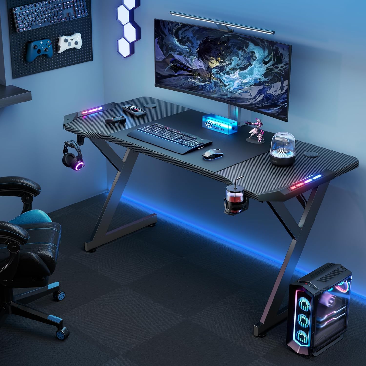 The HLDIRECT 47” desk features LED lighting, a large carbon fiber desktop, ergonomic design, cup holder, and headphone hook for a fully organized workspace.