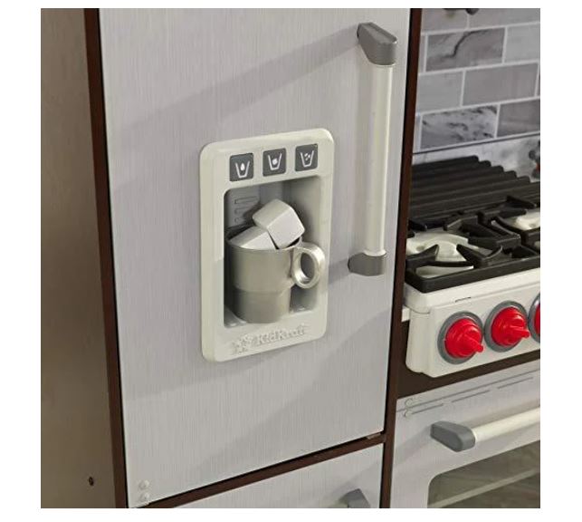 The ultra-modern and innovative KidKraft Uptown Espresso play kitchen with EZ Kraft assembly creates hours of Sizzlin’ fun for aspiring little chefs. featuring beautiful dark wood details and marble-inspired countertops, this sleek kitchen offers up exceptional features that will keep kids engaged. Kids can pretend to boil, sauté and simmer delicious imaginative meals with the all-new cooktop and griddle with light and sound motion sensors. Kids also have the option to cook play food in the microwave with sounds. Refreshing beverages are more fun to make with the functioning ice Maker that dispenses plastic ice cubes. After cooking up imaginative meals, kids can learn practical skills as they rinse off dishes in the sink using the faucet red and blue labels to indicate hot and cold water. Dishes can then be neatly stacked in the spacious dishwasher. A Large refrigerator, a deep freezer and ample shelf space teach children how to organize pots, pans and play food. Innovative EZ Kraft assembly technology speeds up assembly time on the KidKraft Uptown Espresso play kitchen with EZ Kraft assembly, which means less building time and more playing time.