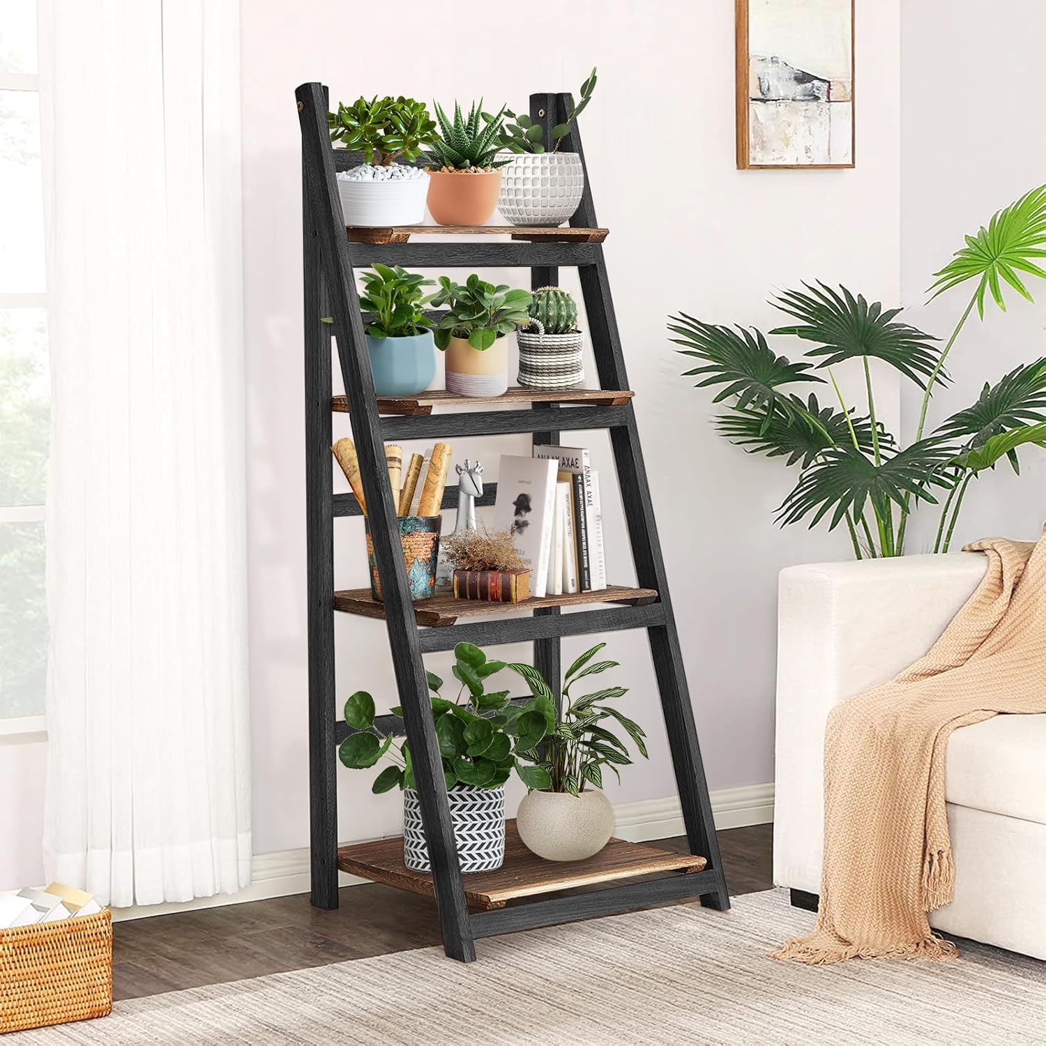 No Installation Required - With its ingenious folding design, the shelf has been skillfully integrated with all the components before delivery. You just need to gently take it out of the package, and in just a few seconds, this 4 tier ladder shelf will stand steadily in its designated position, waiting to carry your books, accessories, plants or the beauty of life. It is like an elf out of nature, ready to infuse your home space with a touch of warmth and elegance
