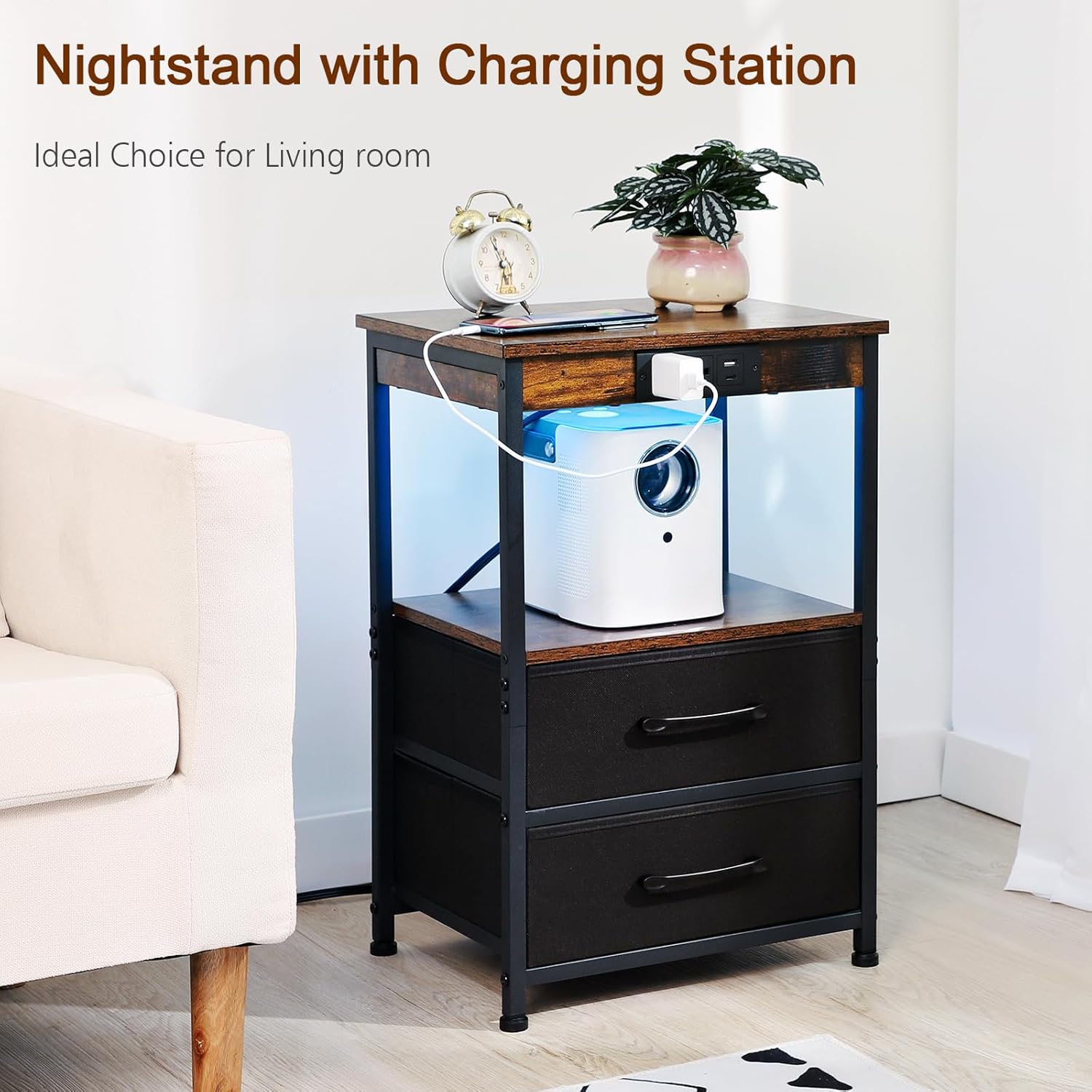 (New Open Box) LOAKEKEL End Table with 2 Drawers, Side Table with Storage Shelf, Nightstand with USB Ports and Outlets, Metal Frame, for Bedroom, Living Room,Rustic Brown HNS122BR-1