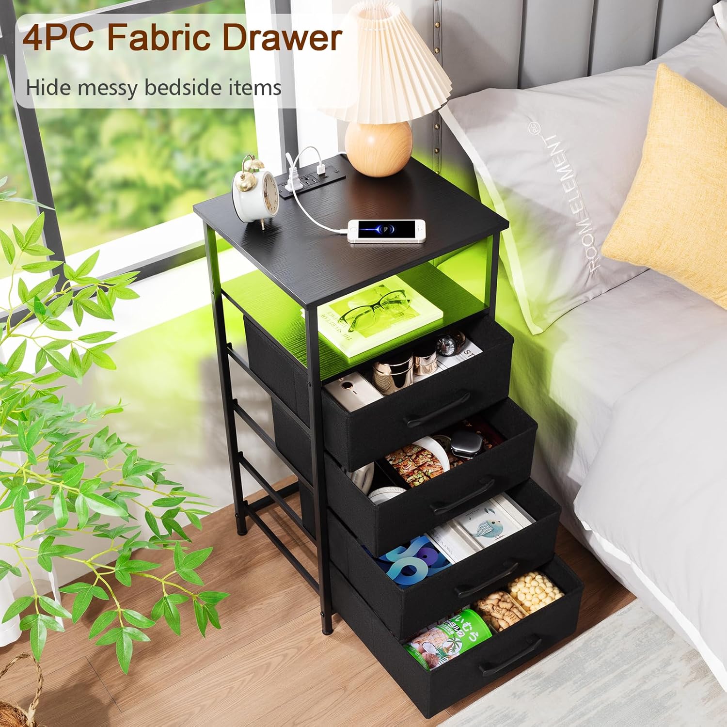 (New Open Box) LOAKEKEL Night Stand Set 2, LED Nightstand with Charging Station, HNS014BK (DS0061)