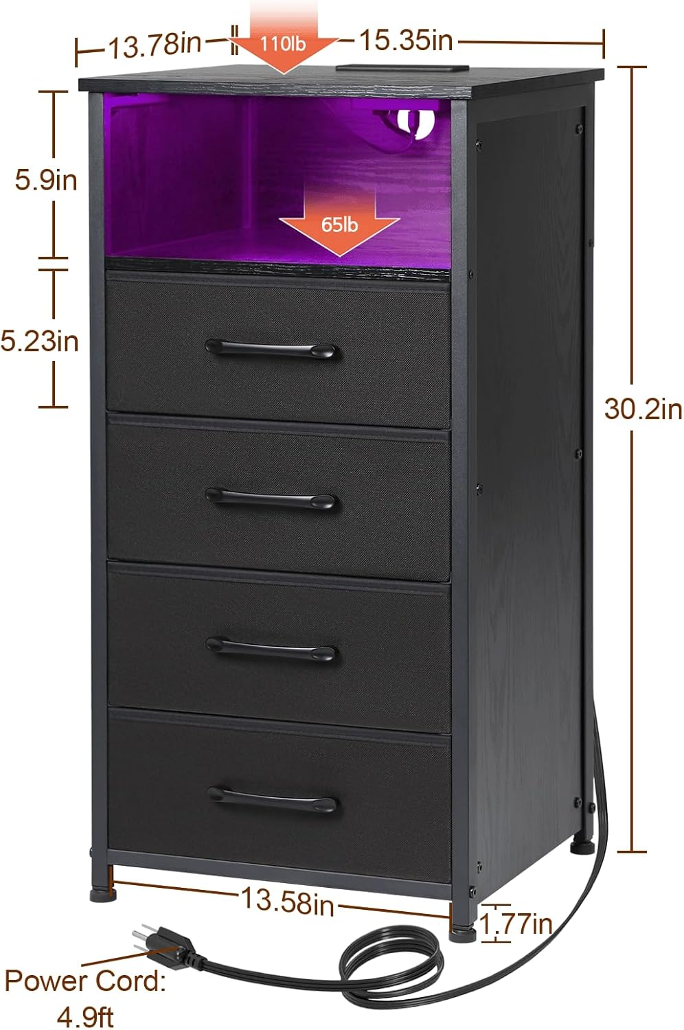 (New Open Box) LOAKEKEL Night Stand Set 2, Tall Nightstand with Charging Station for Bedroom with 4 Drawers, LED End Tables with USB Ports and Outlets, Bedside Table with Storage Shelf, Black, HNS034BK