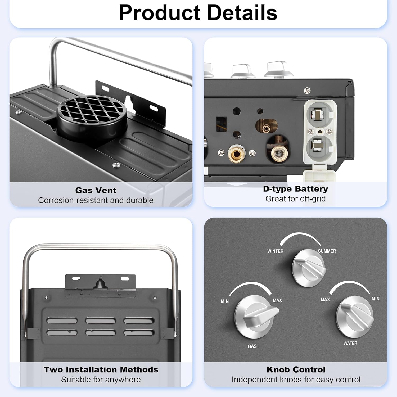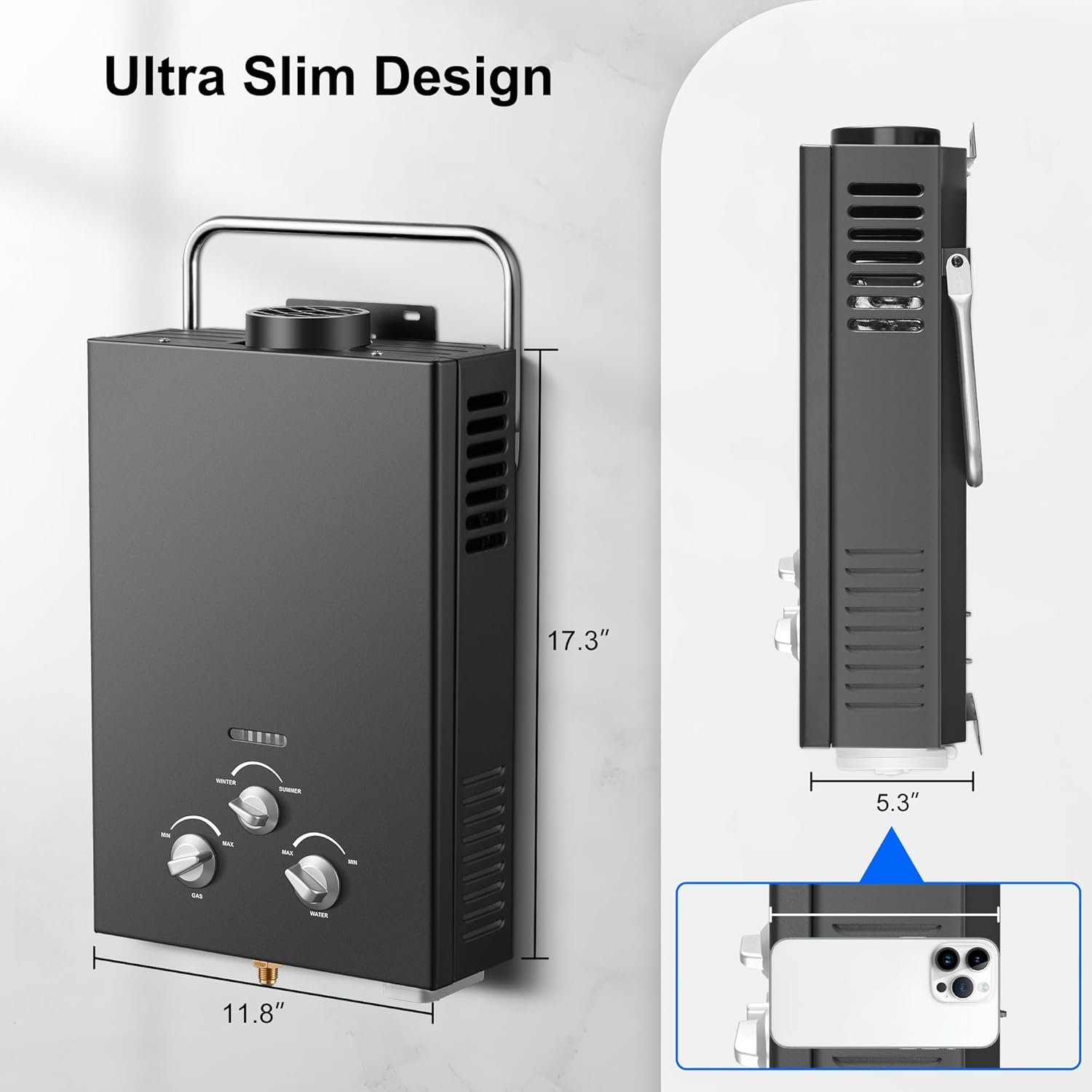 Ultra-Slim 6L Tankless Water Heater - Your perfect companion for camping, RV trips, and outdoor adventures. Compact 11.8"L×5.3"W×17.3"H design weighs just 12lbs with foldable handle for ultimate portability. Includes 5ft premium shower head, gas regulator, US-standard garden hose adapters, and hardware kit. Installs in minutes! The camping water heater features space-saving vertical storage and instant heating performance. Ideal solution for off-grid living and mobile hot water needs.