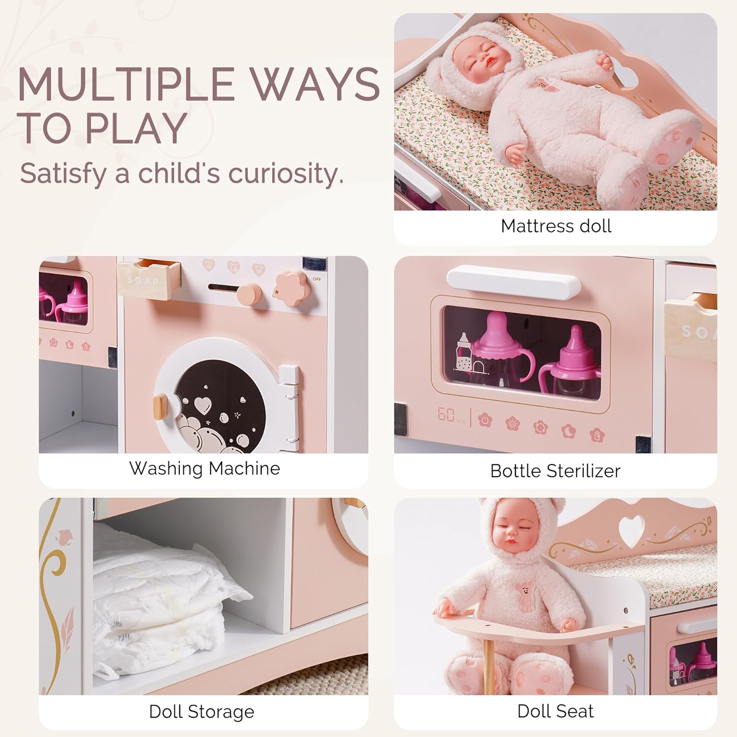 🎭【Roleplay Reimagined】Level up imaginative play! Includes mini "washing machine" , bottle sterilizer for pretend bottle cleaning, and hidden storage space for doll clothes. Kids mimic real-life parenting routines – from laundry day to bedtime prep!🎭