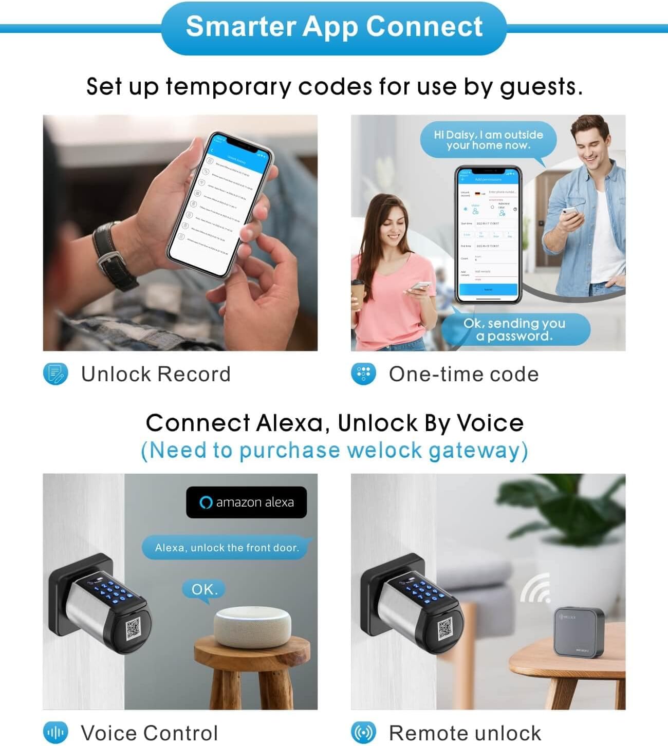 - [ Keyless Entry ] The Keyless entry door lock has five ways to open the door, password, Welock APP, bluetooth, regular key, RFID Card. Allows you to unlock doors without having to hunt around for keys.